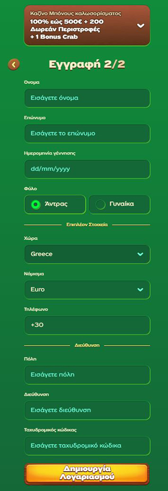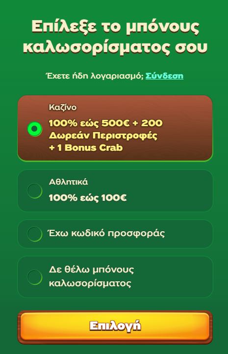 | Μπόνους καλωσορίσματος | 100% μέχρι και 500€ + 200 δωρεάν περιστροφές + 1 Bonus crab |