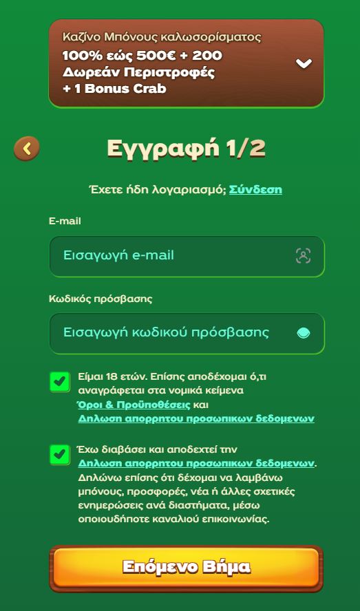 Βήμα 3ο. Αναγράψτε το email με το οποίο θέλετε να προχωρήσετε σε εγγραφή και προσθέστε έναν κωδικό πρόσβασης. Πριν πατήσετε επόμενο βήμα, επιλέξτε τις επιλογές περί της πολιτικής απορρήτου, του ορίου ηλικίας και των όρων και προυποθέσεων του καζίνο.