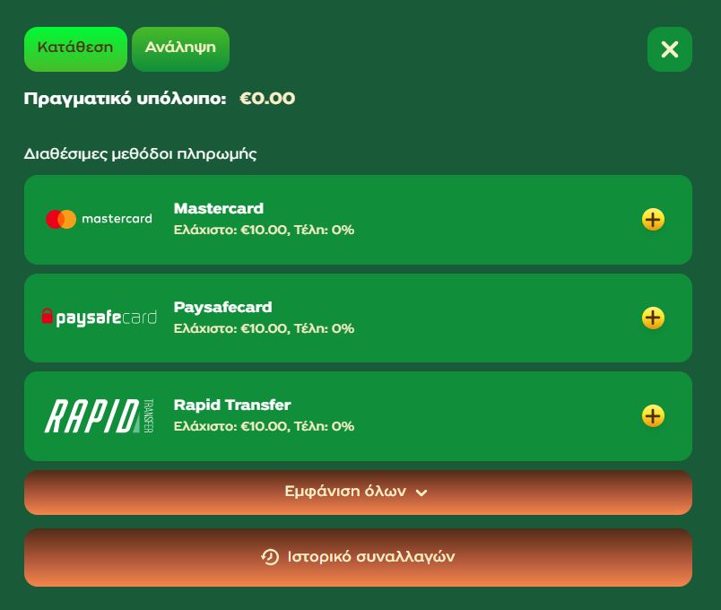 | Τρόποι κατάθεσης | Mastercard , Paysafecard, Skrill, Neteller, MiFinity, USDTether (TRC, ERC, BEP), Bitcoin, Ethereum, Litecoin, Doge, Ripple, USDCoin, Bitcoin Cash, Cardano |